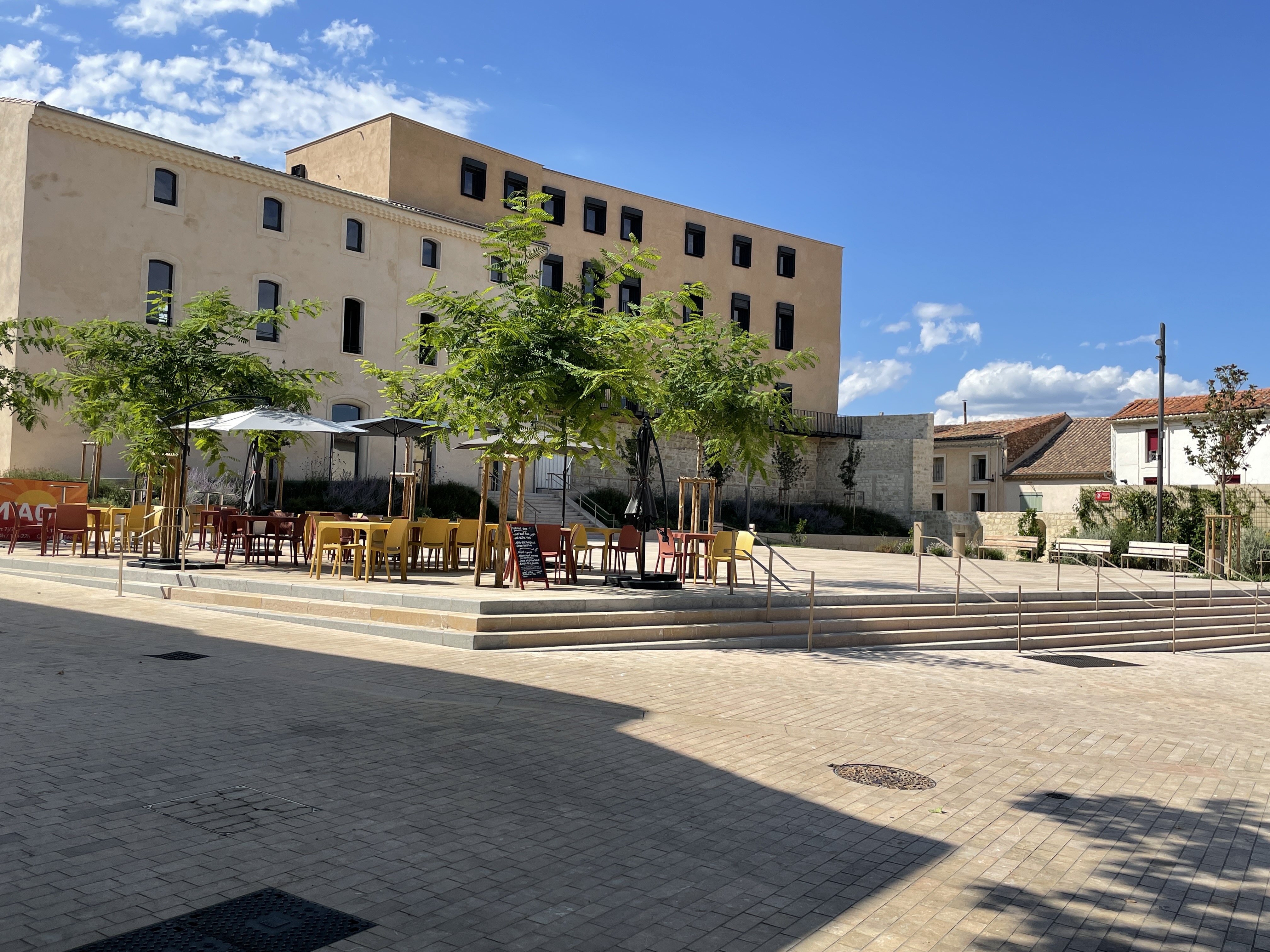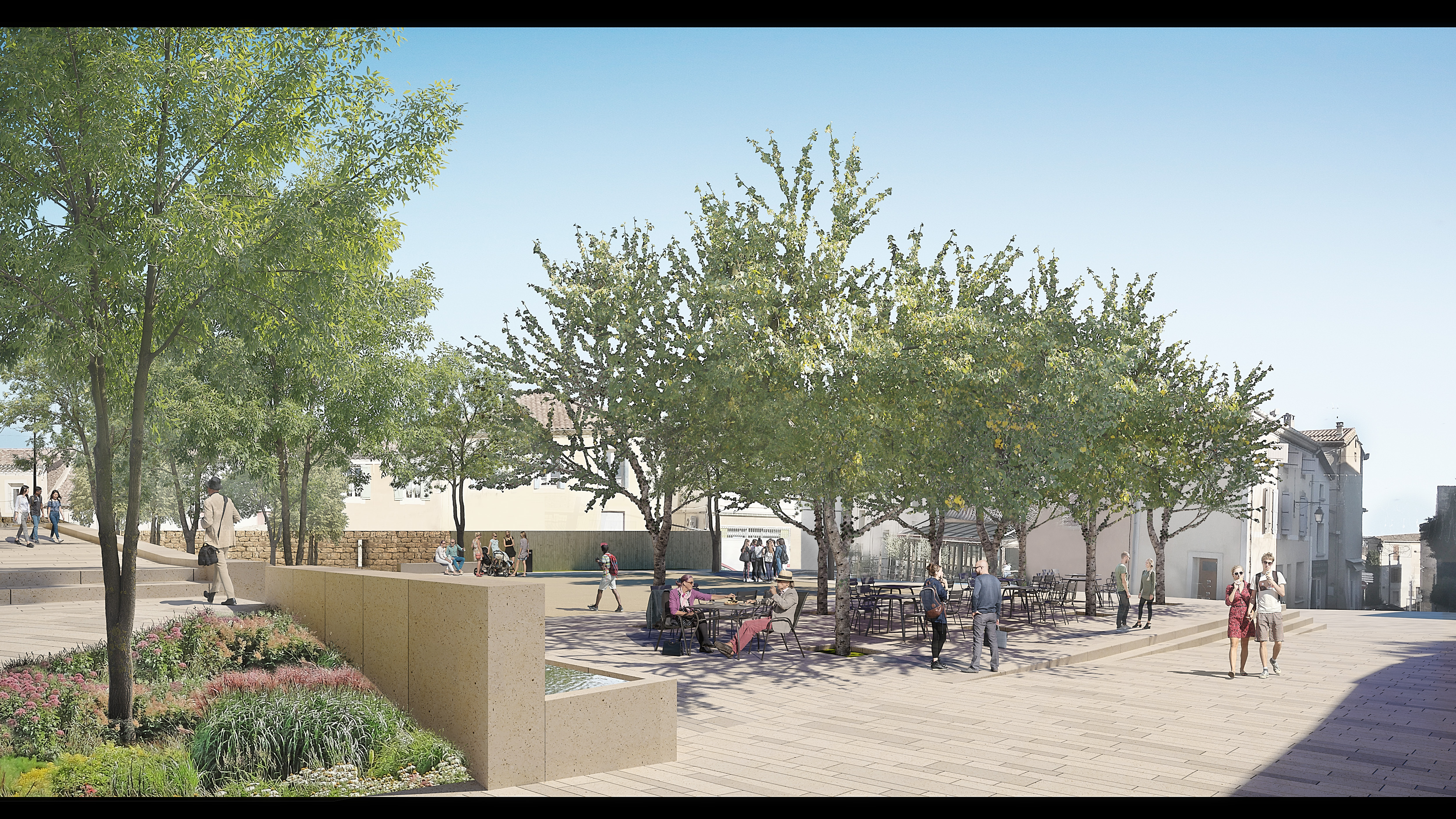 La démolition de l’ancienne poste au cœur du village a permis de récupérer un espace de respiration dans le centre ancien. Celui- ci est transformé́ en place. Un grand emmarchement en pierre permet de relier le bâtiment de l’ancienne maison de retraite avec la place et son parvis. La plantation d’arbres structure ce nouvel espace extérieur tout en apportant de l’ombre et de la fraicheur. Le végétal vient recoloniser le centre-ville se faufilant entre la muraille et les ruelles du tissu ancien.